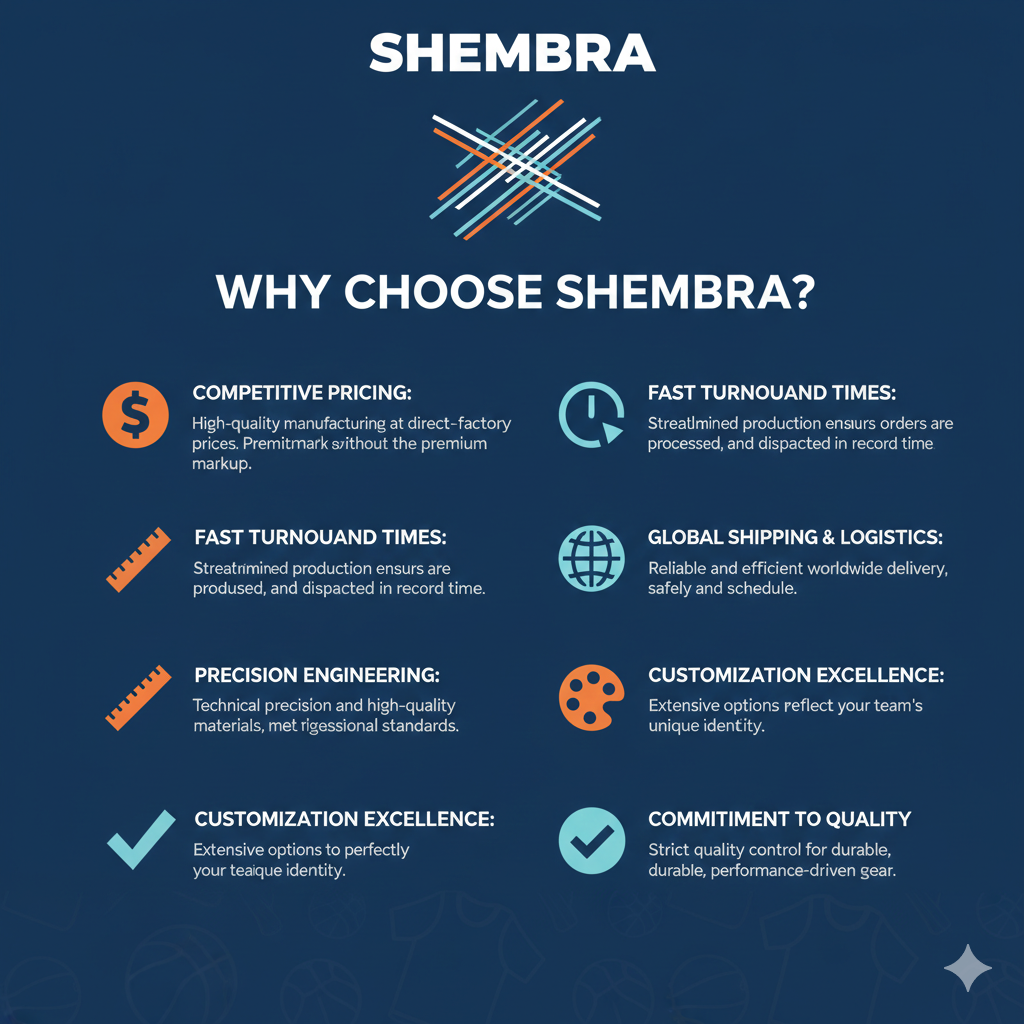 “At SHEMBRA, we don’t just manufacture sportswear—we build the armor that athletes wear to victory. As a premier global manufacturer and exporter, we specialize in high-performance sports uniforms, athletic apparel, and professional gear bags. Every stitch is placed with precision, and every fabric is chosen with the athlete’s comfort and performance in mind.”